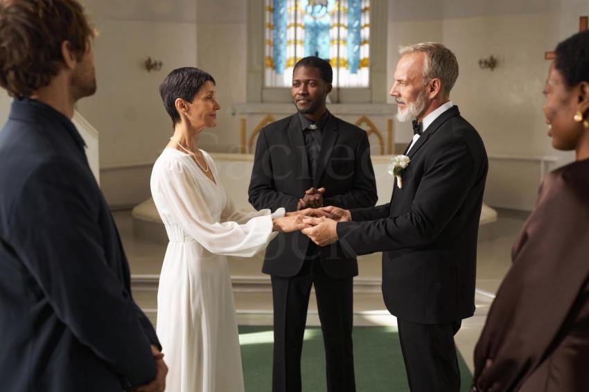 Senior Bride and Groom Holding Hands at Church Altar on Wedding Day